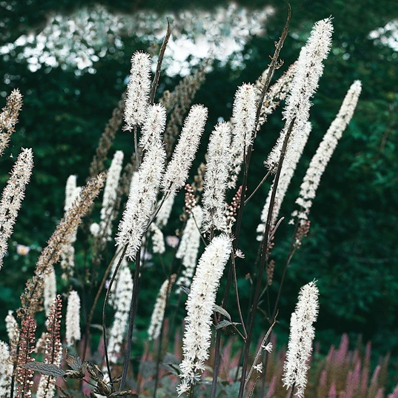 Stolz und filigran erhebt sich die strahlend weiße Blüte der September-Silberkerze über dem dunkelroten Laub. Ab September verzaubert die Blüte der robusten Silberkerze mit anmutiger Schönheit. Durch die späte Blütezeit wird die winterharte Staude zu einer wichtigen Nahrungsquelle für viele Schmetterlinge und Insekten. Über Wochen lassen die schlanken, leicht duftenden Blütenähren das Staudenbeet und die Rabatte in einem ganz besonderen Licht erstrahlen.
