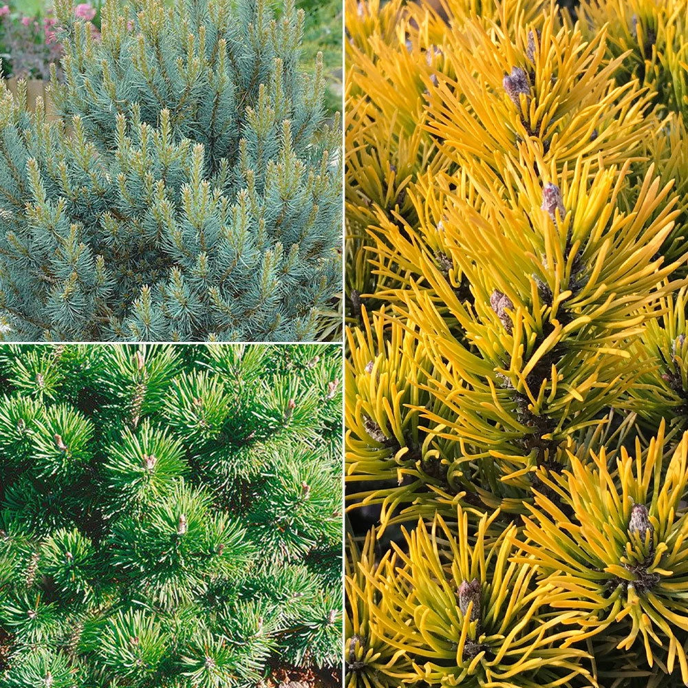 Unser Gehölz-Set Kieferveredelungen kompakt enthält drei ausgesuchte Kiefern, die ebenso anspruchslos wie dekorativ sind: Wintergelbe Bergkiefer, Silberblaue Strauchkiefer und Kugel-Bergkiefer.