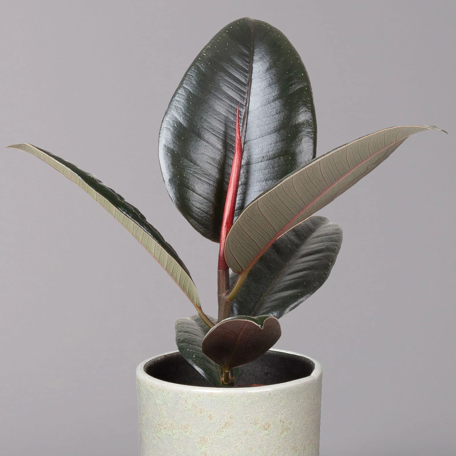 Der Gummibaum (Ficus elastica ‚Robusta‘) gilt als Klassiker unter den Zimmerpflanzen und verschönert seit den 1950er Jahren Wohn- und Arbeitsräume. Nachdem die Pflanze längere Zeit als Relikt vergangener Zeiten gegolten hatte, feiert sie heute ein strahlendes Comeback und wird besonders wegen ihrer luftreinigenden Eigenschaft und der aparten Optik geschätzt. Charakteristisch sind die breitovalen, ledrig anmutenden Blätter, die eine glänzende Oberfläche besitzen und kräftig dunkelgrün gefärbt sind. Je nach Lichtsituation verzweigt sich der Gummibaum und bildet eine breite Krone aus. Bei guter Pflege kann die Pflanze bis zu 2 Meter hoch werden.