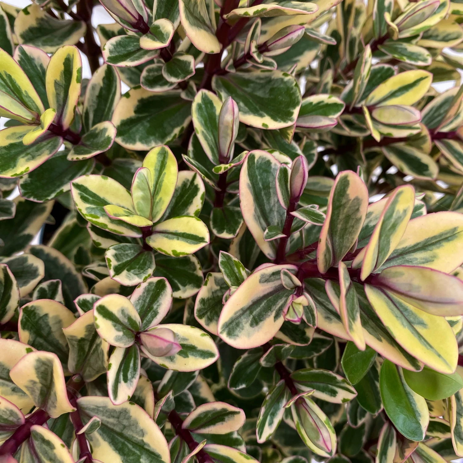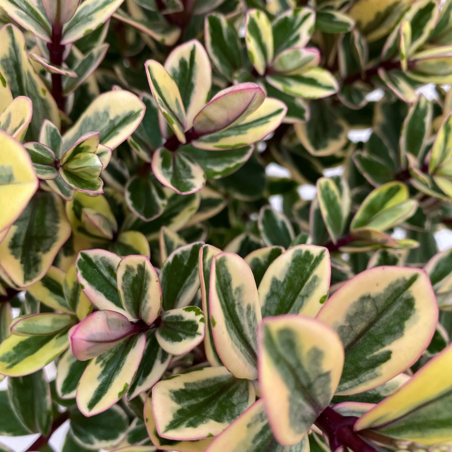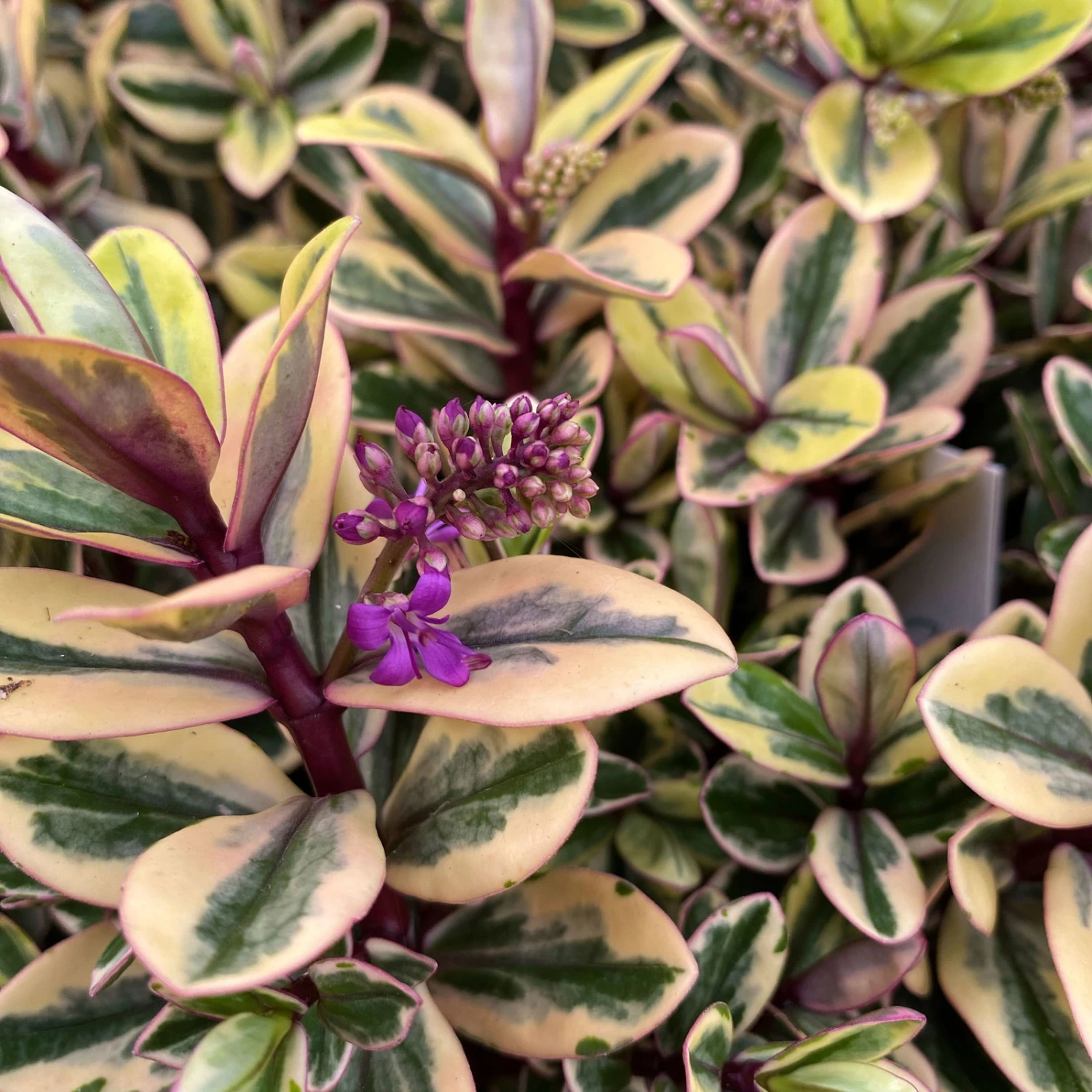 Die großen, buntlaubigen, lang gestreckten Blätter der Strauchveronika (Hebe andersonii Addenda®) überzeugen in einem Mix aus 3 Farben. Die Pflanze wächst aufrecht und buschig. Die Strauchveronika kann eine Wuchshöhe von 40 bis 60 cm erreichen und auch entsprechend breit werden.