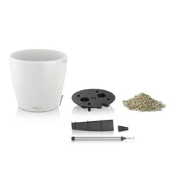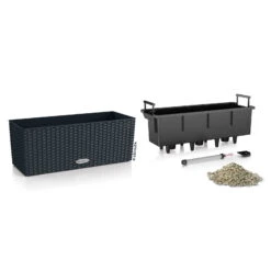 Im Lieferumfang des Cubico Cottage 30 All-in-One-Sets sind alle Materialien enthalten, die zum Pflanzen benötigt werden: mokkafarbenes Lechuza Pflanzgefäß Cubico Cottage 30, Pflanzeinsatz, Granulat für die Drainageschicht und Wasserstandsanzeiger.