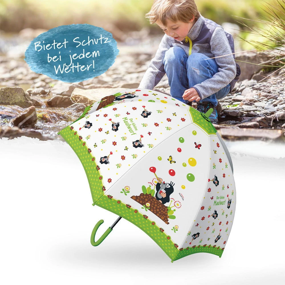 Mit dem Regenschirm ‚Der kleine Maulwurf‘ in Grün macht ein Spaziergang bei jedem Wetter Spaß, denn der tapfere kleine Maulwurf und seine Freunde sind immer dabei. Der Kinderschirm bietet zuverlässigen Regenschutz und sorgt dank der Perlmuttoptik für strahlende Kinderaugen. Der Handgriff liegt bequem in der Hand, für ein Plus an Sicherheit sind die Spitzeln abgerundet.