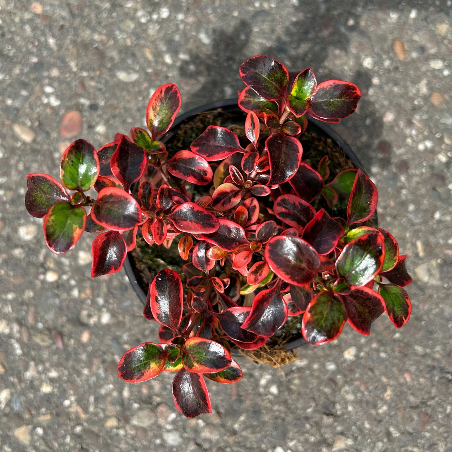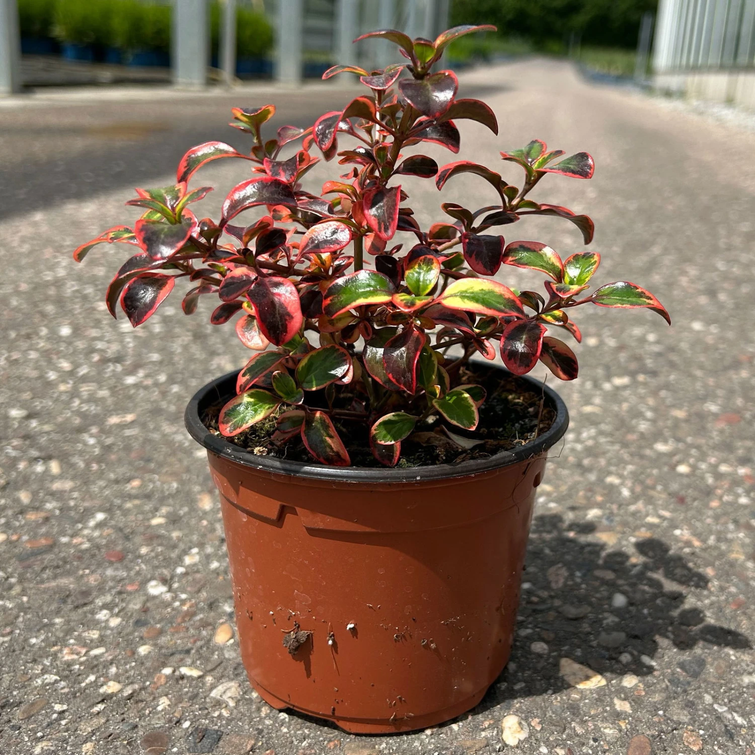 Die kleinen, rot-grünen Blätter der Koprosma, Coprosma repens ‚Red Ruby®‘, auch Spiegelbusch genannt, sind oval, leicht glänzen und bezaubern durch ihre intensive rötliche Färbung bei kühleren Temperaturen. Der Spiegelbusch wächst, wie der Name vermuten lässt, buschig und aufrecht. Diese bedingt winterharte Pflanze kann eine Wuchshöhe von ca 40 cm erreichen.